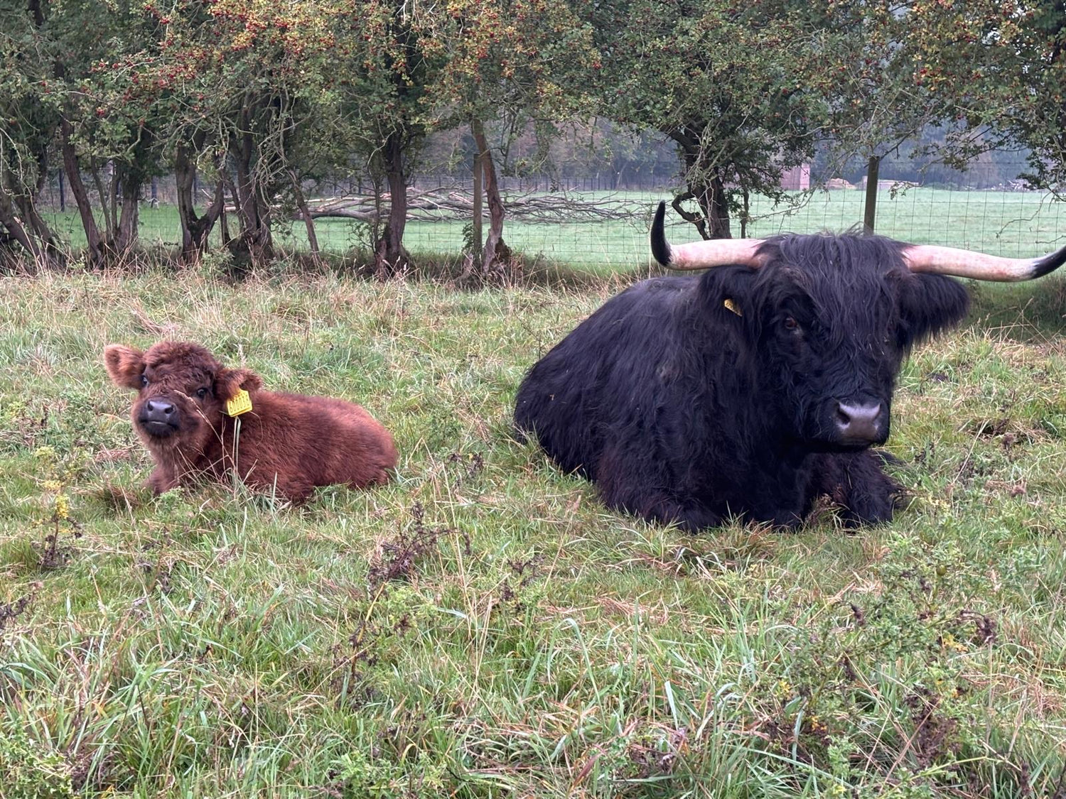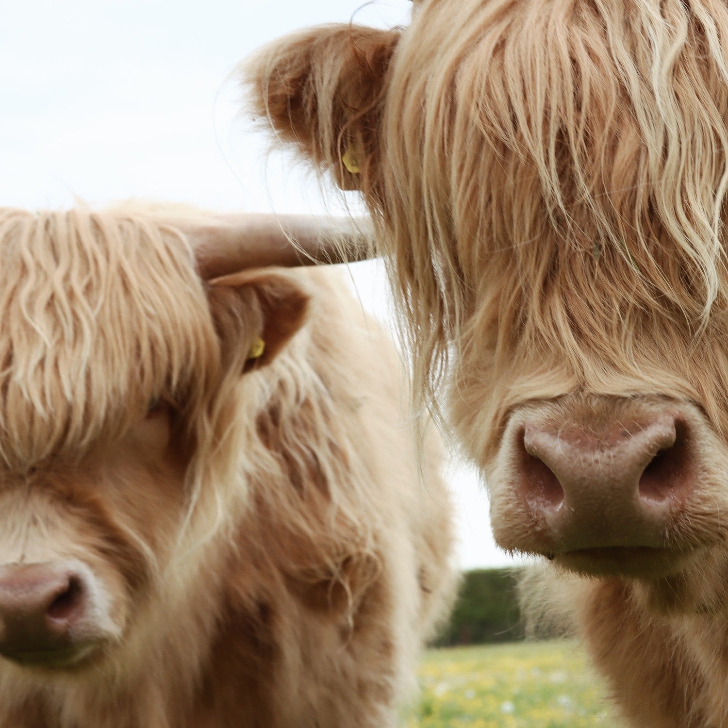 The Highlands graze outside all year round but also have access to sheds. The grass is grown naturally and sustainably without using any chemical sprays or fertilizer. The Highlands are thoroughly spoilt with attention and plenty of apples, have access to scratching brushes, and yoga balls to play with.